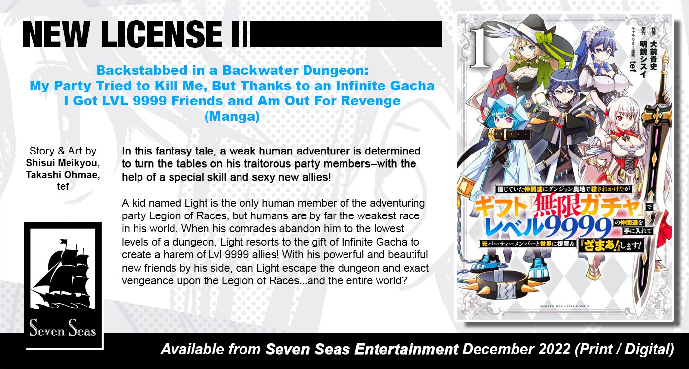 ٹوئٹر Seven Seas Entertainment Twitter پر Brand New License Announcement Backstabbed In A Backwater Dungeon My Party Tried To Kill Me But Thanks To An Infinite Gacha I Got Lvl 9999 Friends